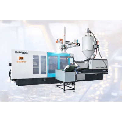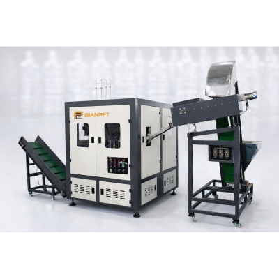 Máquina automática para produção de garrafas PET com 4 cavidades e sistema robotizado de retirada. Alta eficiência e produtividade, ideal para fabricar garrafas de água, refrigerante, óleo e produtos de limpeza. Produção aproximada de até 2.500 garrafas por hora.